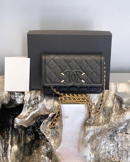 • Chanel Wallet on Chain Quilted Cc Filigree Woc Black Caviar Leather Cross Body Bag