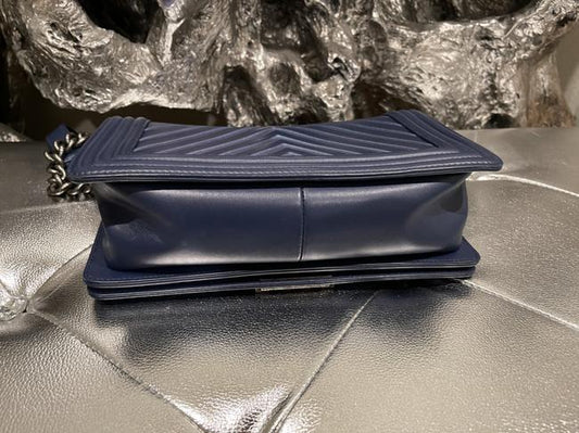 Classic Flap Boy Chevron with Holographic Pvc Old Medium Blue Lambskin Leather Cross Body Bag