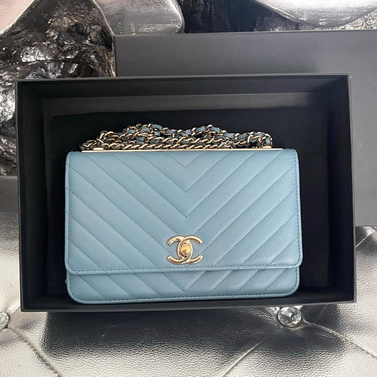 Chanel Wallet on Chain Lambskin Chevron Quilted Trendy Cc Woc Light Bl Blue Leather Cross Body Bag