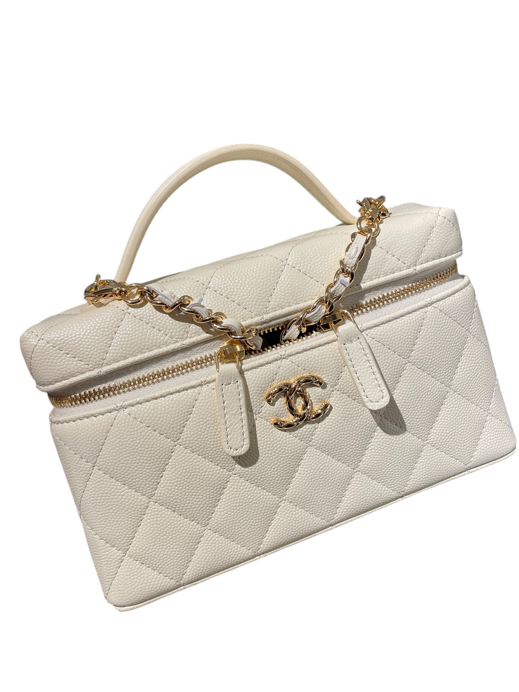 The most sought-after Vanity Case of the year — always sold out worldwide. Featuring stunning light beige caviar-grained leather, a classic canvas interior with card-holder slots, and elegant light gold hardware. The iconic CC logo sits proudly on the front. This versatile piece can be worn crossbody, over the shoulder, or styled as an evening clutch by tucking or detaching the chain. Chic, timeless, and perfect for any occasion. Chanel Fall/Winter 2025 Collection.