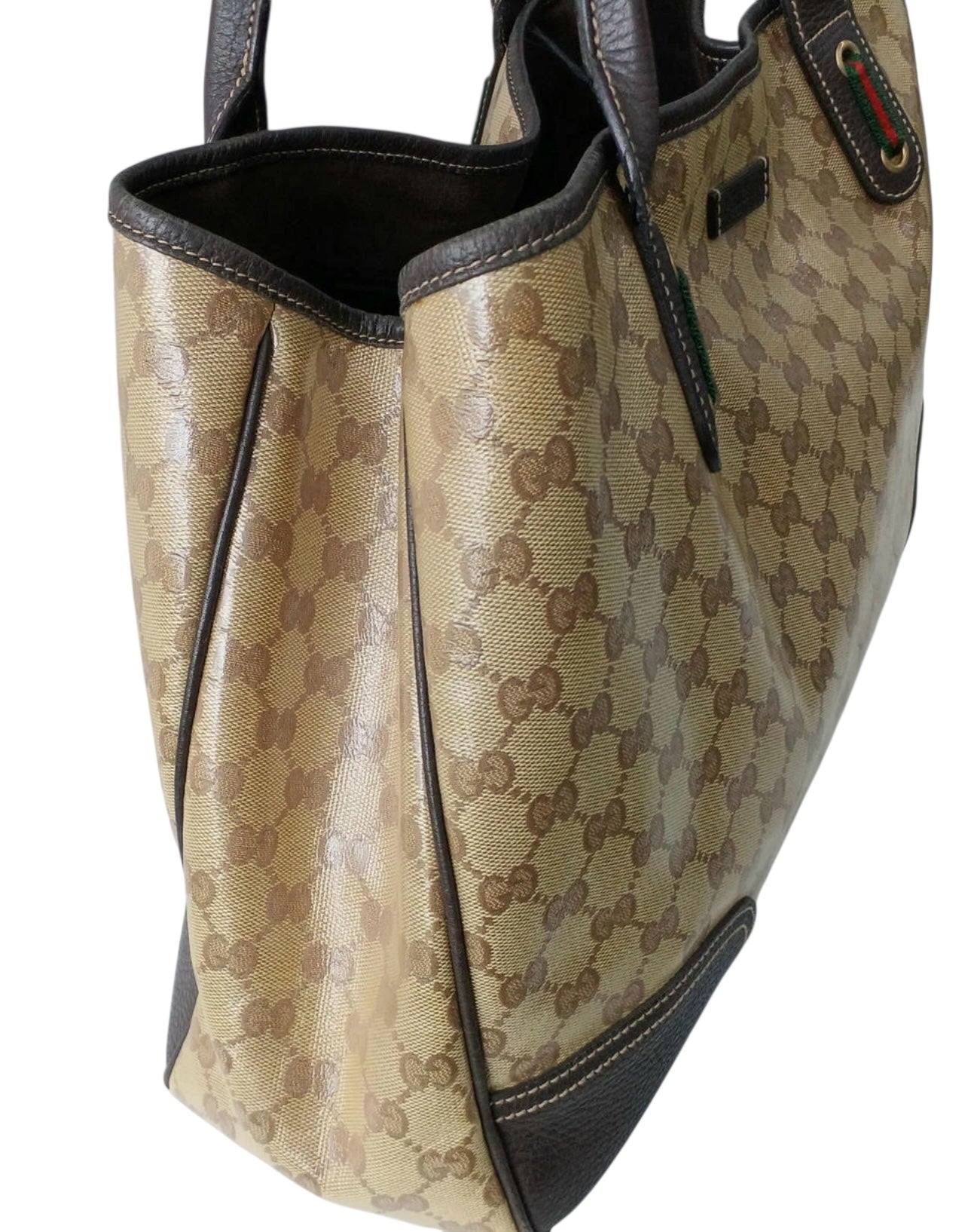 This authentic Gucci tote is crafted from the iconic GG monogram canvas and elevated with dark brown leather trim and reinforced corners for added durability. Designed for effortless everyday elegance, it features a spacious interior and plush double shoulder straps, making it an ideal companion for both daily routines and travel. A velvet monogram overlay introduces rich dimensional texture, beautifully balanced by red leather trim, handles, and side ties. Presented in the versatile MM size, it offers ample room for essentials while maintaining a sophisticated silhouette. Gold-tone hardware with fine red stitching adds an elegant, luxurious finish.