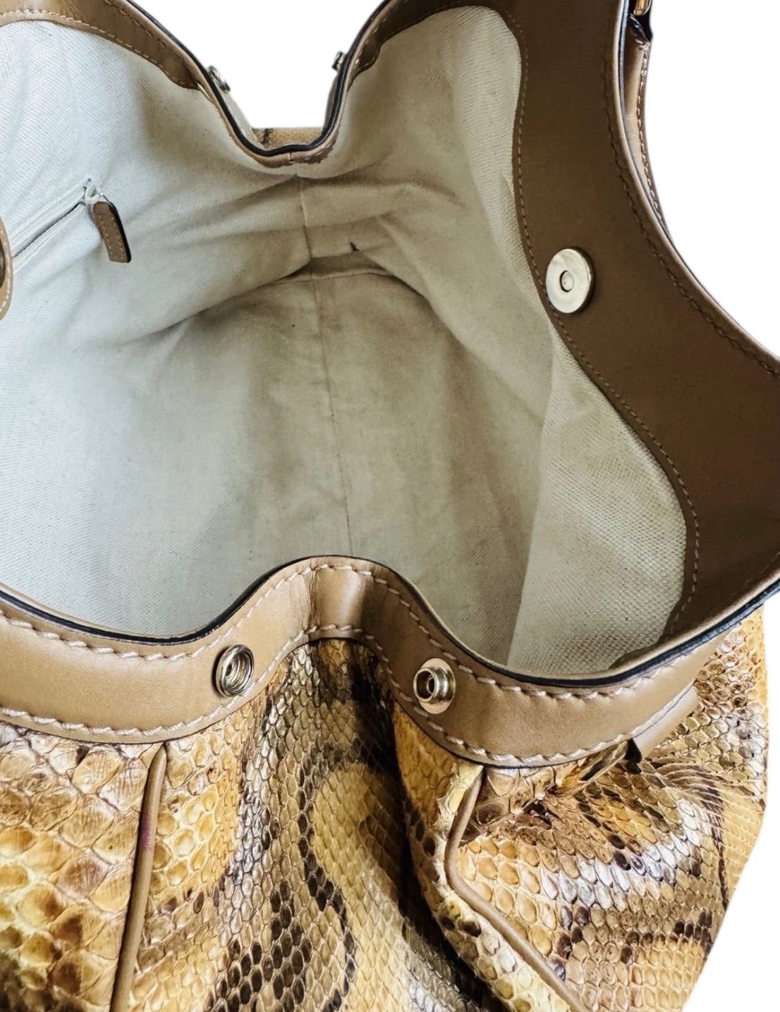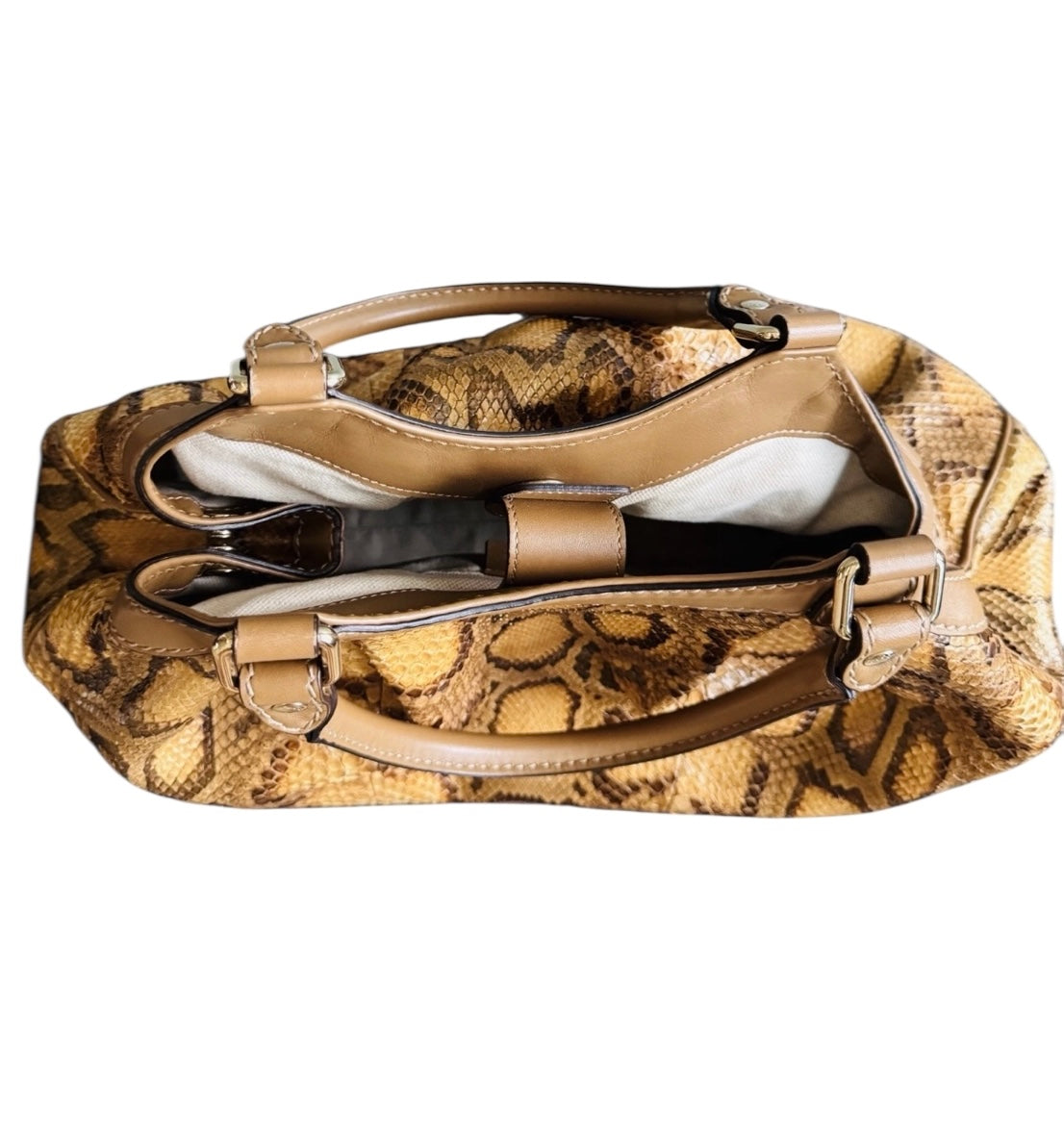 Exterior: Python leather retains its natural pattern and sheen, shows minor scuffs and natural wear