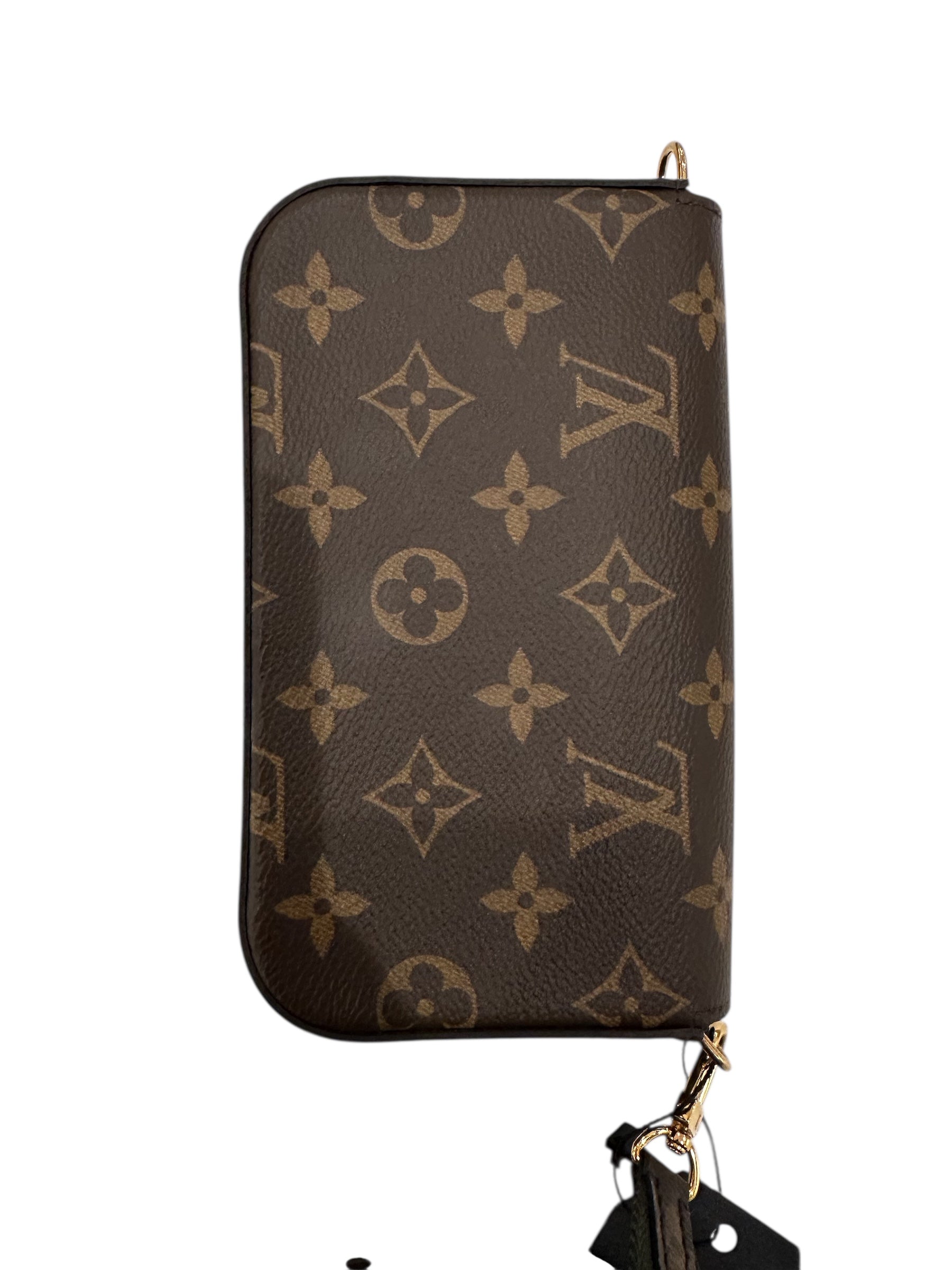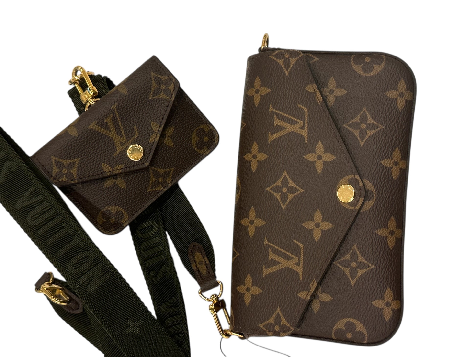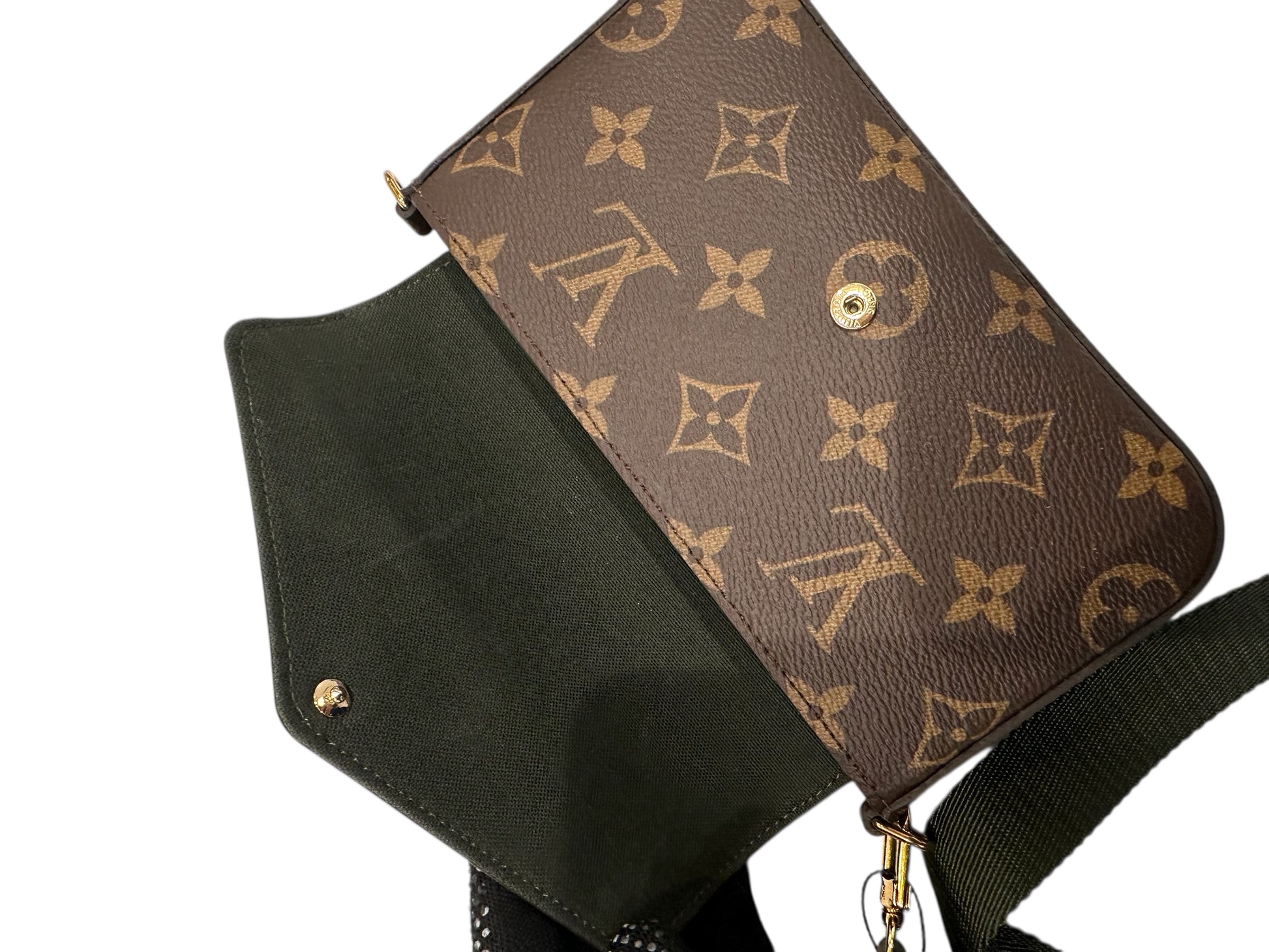 This is an authentic LOUIS VUITTON Monogram Felicie Strap & Go in Kaki. This chic crossbody bag is crafted of monogram-coated canvas and features a removable khaki canvas strap and gold hardware. The top zipper opens to a brown fabric interior with a flat pocket. Enjoy this fashion-forward bag only from Louis Vuitton!