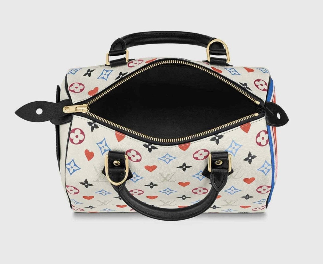 Authentic Limited Game On Speedy Bandouliere 25 is in white coated canvas with golden tone hardware and features a playing card inspired print, black leather top handles, trim and removable crossbody strap with polished gold tone hardware, removable lock and zip top closure.