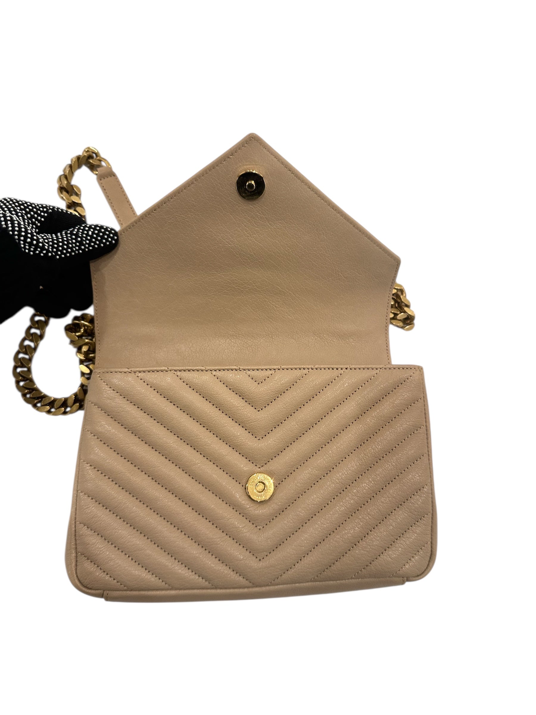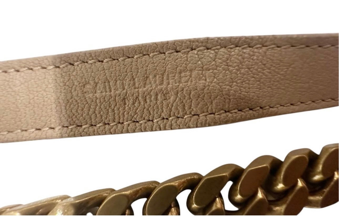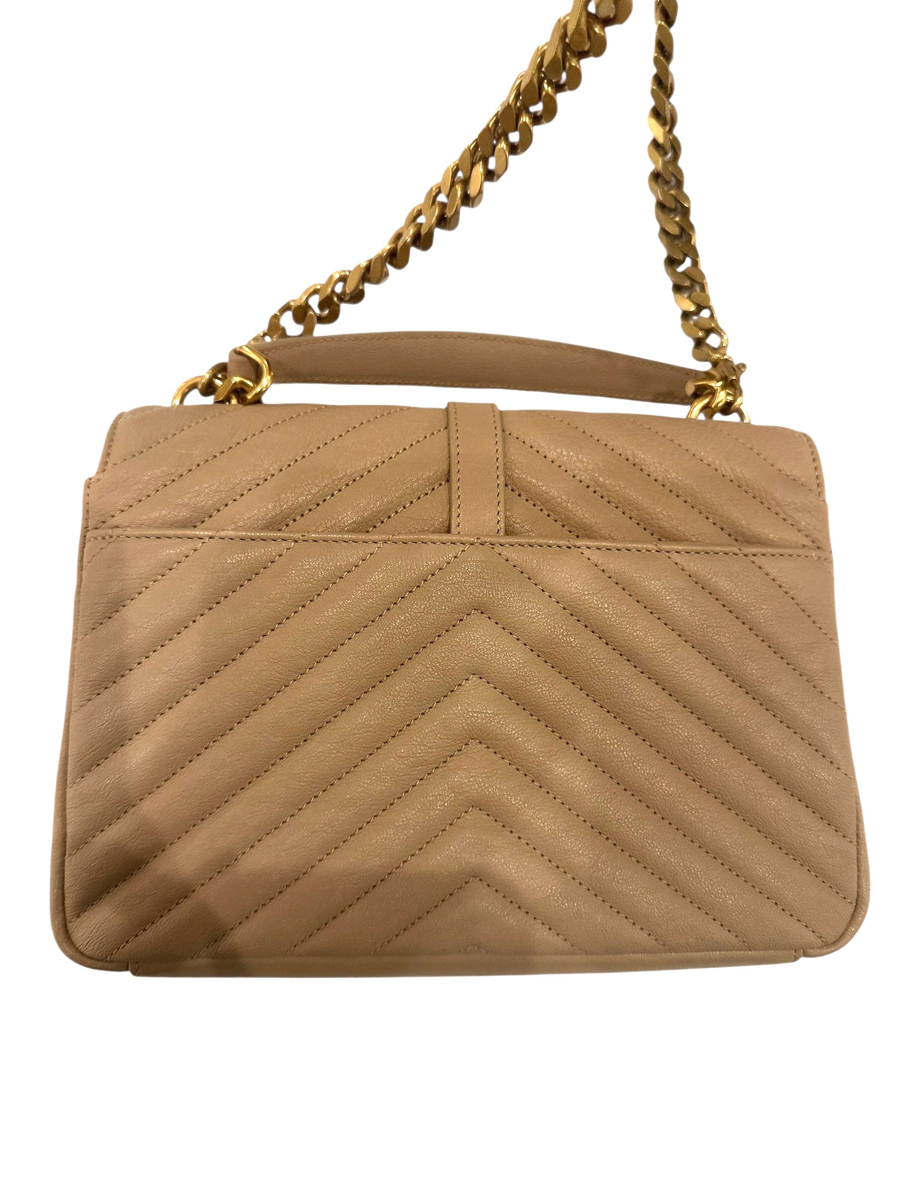 Authentic Saint Laurent Dark beige COLLÄGE medium quilted leather chain bag featuring a classic quilted design, logo detailing, and a structured top handle. Secures with magnetic snap closures and includes multiple compartments separated by an internal zip pocket. Finished with a flat back pocket and elegant chain shoulder straps. Can be worn crossbody or carried by hand.